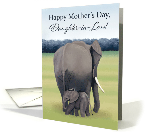 This "Happy Mother's Day, Daughter-in-Law!" card features a digital watercolor painting of a mother and baby African elephant, and a poem celebrating the love, strength, wisdom and grace of mothers everywhere.