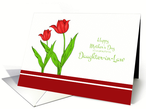 Two red tulips with a crisp and clean white background makes a cheerful Mother's Day card for any mother. Design also available for other family relations and Mother's Day birthdays. Original Design by Sue Nollmeyer©2013. 31313