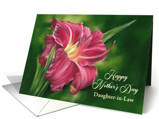 The blossom of a red daylily is wonderfully enhanced by the rich green backdrop in the floral artwork in soft pastel hues embellishing the cover of this Mother’s Day card with text in a warm, light yellow that may be personalized for a daughter-in-law or for any mother.