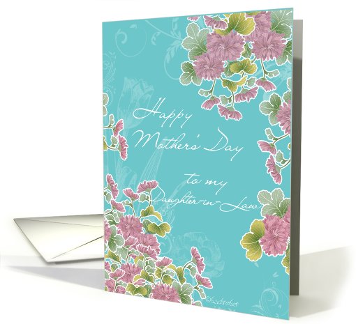to my Daughter-in-law, happy mother's day card, pink chrysanthemum flowers, turqoise