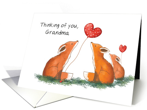 Three foxes are looking up at a red heart balloon with white dots. The little fox also has a heart balloon. Cute card to send to grandma from the grandchildren. There could be one grandchild or several. Let Grandma they think of her and love spending time with her.