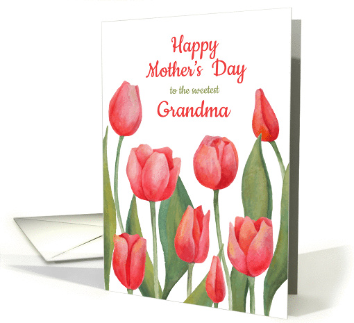 This card is for Happy Mother's Day. There are watercolor red flowers and leaves in the middle of the card. Hand drawn illustration for grandma. Can be a great holiday gift.
