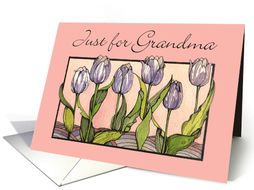 Send Grandma Happy Mother's Day wishes with this art nouveau inspired ink and watercolor of elegant purple tulips. The text, " Just for Grandma" is in script in the pink border.