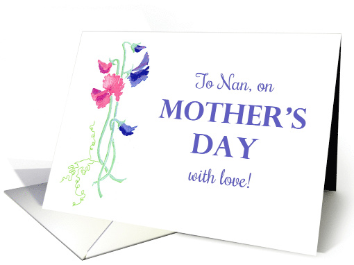 A very pretty Mother's Day card for a 'Nan' with pink and blue Sweet Peas, from a watercolour painting based on a screen-print by Judy Adamson. The front cover greeting, 'To Nan, on Mother's Day with love!' is in blue lettering on the white background and you can change or delete the inside message if you wish.