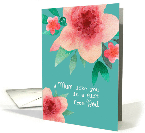 Tell your Mum how much you appreciate her with this Christian Mother's Day Card. Text front of Card: A Mum like you is a Gift from God. This pretty card features a floral design (watercolor of bright red and pink flowers and green leaves on a mint background). Text inside card is a scripture verse and the text: Thank you, Mum, for your unfailing love. To have you is such a blessing. Happy Mother's Day!" You can modify text to suit your requirements.