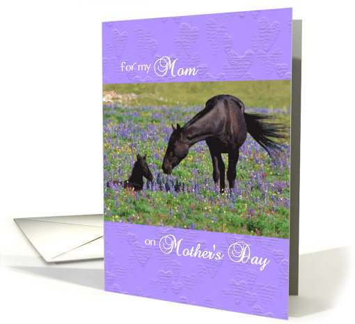 This Mother's Day card for Mom showcases a beautiful Mustang mare and her foal. The meadow is filled with bluebonnets. Hearts which appear embossed make up the background. Photo courtesy of the B.L.M., U.S. Government.