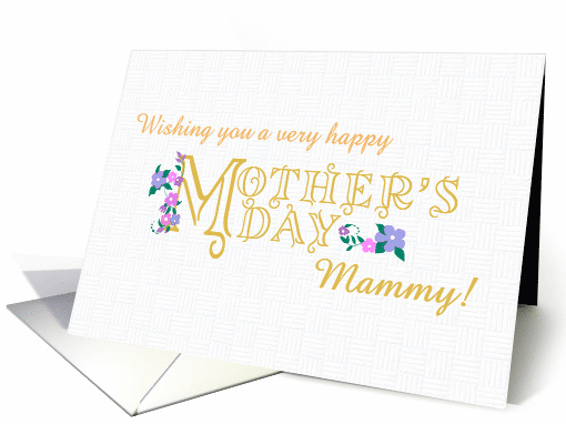 A pretty Mother's Day greeting card for your your Mammy. The front cover greeting, in gold-effect lettering, is, 'Wishing you a very happy MOTHER'S DAY, Mammy!', There are pink, blue and pale mauve flowers trailing up the outside of the large letter 'M' at the start of 'MOTHER'S' and more, similar flowers trailing along after the word, 'DAY. The background is lightly textured white and the inside message is just a suggestion that you can easily customize or delete altogether if you wish.