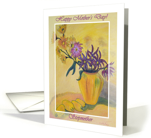 This painting shows a yellow vase with flowers and lemons. It is based on an original painting on canvas by Artcor7 artist. The card has this image, a white border with a transparent accent, and the expression: "Happy Mother's Day! Stepmother"