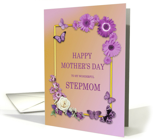 A lovely floral mother's day card for stepmom. Flowers and butterflies on a golden frame.A lilac theme gives a relaxed yet luxurious feel. A wonderful card to give to someone you care for on their birthday. The gold effect is digital.