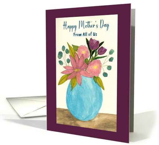 Artist Notes: Send someone special best wishes on Mother's Day with this colorful greeting card from a group. A gorgeous bouquet of pink and purple flowers in a striking blue vase is depicted in the watercolor illustration.