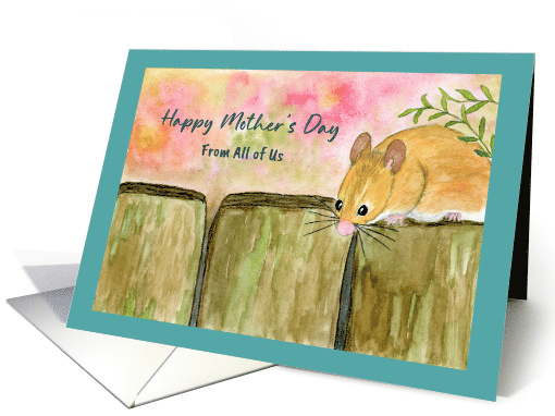 Delight a wonderful Mother with this charming Mother’s Day card from a group, featuring a sweet watercolor illustration of an inquisitive little brown mouse peeking over a rustic wooden fence. Surrounded by a lush garden of vibrant blooms, this adorable scene is sure to bring a smile to her special day.