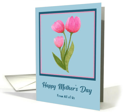 Celebrate a special Mother this Mother’s Day and this greeting card from a group designed with a blooming bouquet of watercolor tulips in radiant pink, framed by lush green leaves and a gentle blue background.