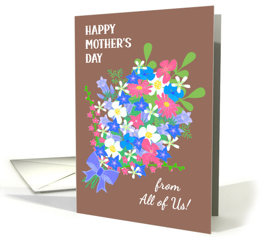 A pretty, floral greeting card for Mother's Day from a family or group. The front cover has a bouquet of pink, white and blue flowers, tied with a blue bow, on mocha-coloured background. The front cover greeting, in white lettering, is, 'HAPPY MOTHER'S DAY' at the top and, 'from All of Us!' in handwriting script, at the bottom. The inside message is just a suggestion and you can easily change it or delete it if you prefer a 'Blank Inside' card.