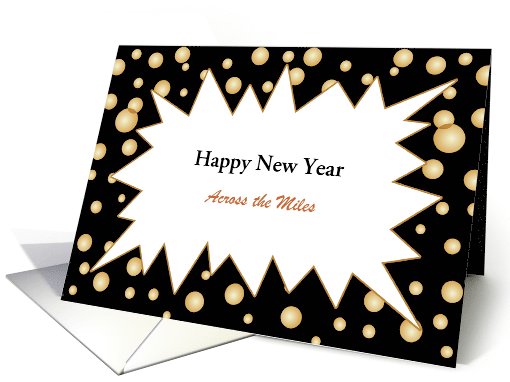 CUSTOMIZE the front & inner verse of this retro, Happy New Year Across the Miles greeting card, with illustration of gold colored bubbles. Select "Personalize Cover & Inside Text" to change text on card front and to change greeting on inner verse.
