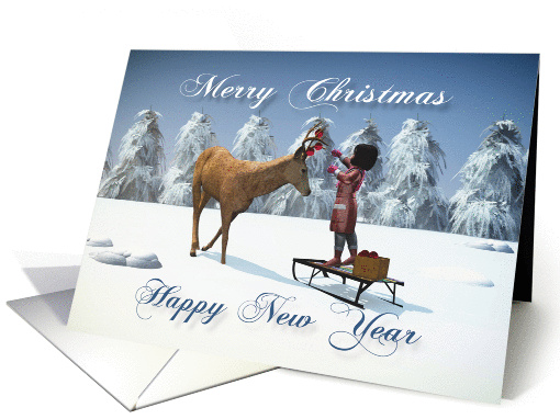 A whimsical fantasy Holiday card. A cute little girl decorates a reindeer with Christmas balls. Inside there is a text which you can customize to something very personal.