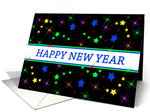 Happy New Year's greeting card with blue,green,yellow,red stars over a black background. Inside verse can be customized during the check out process. Thank you ... Sheryl Kasper Card Store
