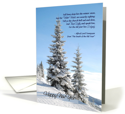 A New Year's card featuring fresh snow on conifers, a clear blue sky, and a poem by Alfred Lord Tennyson. You may add to/change the inside sentiment or switch to a matte finish at no additional charge. Just click on "Personalize".