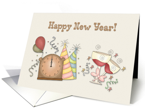 Start the year off right with this fun New Year greeting with clock striking midnight, champagne glasses, party streamers and balloons. Created using artwork by Rajiv's Graphics