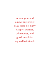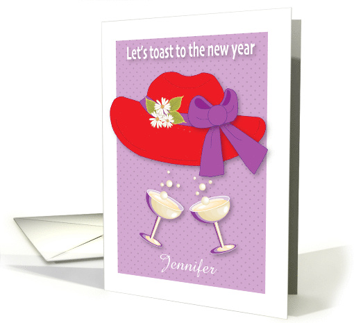 Send this custom name new year's card to a red hat friend. The cover features a white border, red hat with a purple ribbon, white daisies, two champagne glasses, and a white headline. The personal name is placed at the bottom of the card. The inside message may be changed, if you wish. ©Gail Pepin