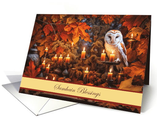 Samhain card with a beautiful scene of an owl surrounded by gorgeous fall foliage and candlelight. Custom text too.
