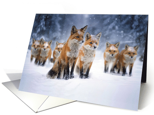 Winter solstice card with a fox pack in the snow. A forest setting with trees laden with ice and snow and beautiful red foxes.