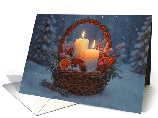 Happy Yule card with a basket of winter solstice decorations and candles. Set at night in the snow. The basket has the look of vines.