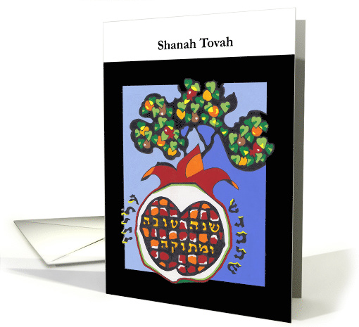 The pomegranate is traditionally eaten on Rosh Hashanah, with its many seeds seen as a symbol of good deeds. This design shows the fruits of these seeds, sprouting as a tree filled with different fruits. The pomegranate is cut in half, showing a colorful mosaic of seeds and a New Year blessing in Hebrew. The bright colors and sky blue background represent positive hopes for the New Year.