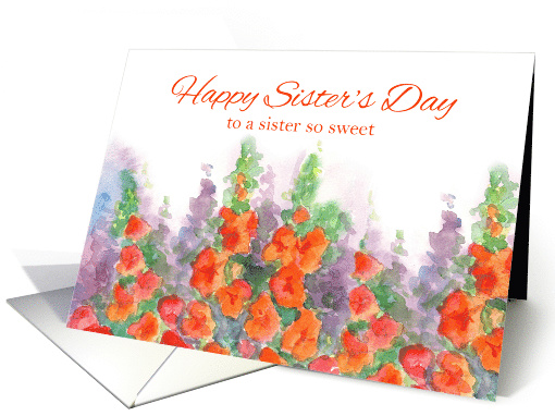 Happy Sister's Day to a sister so sweet decorated with bright orange and red gladiolus flowers painted with watercolor with touches of purple and blue in the background. Nice way to share some joy with your sister.