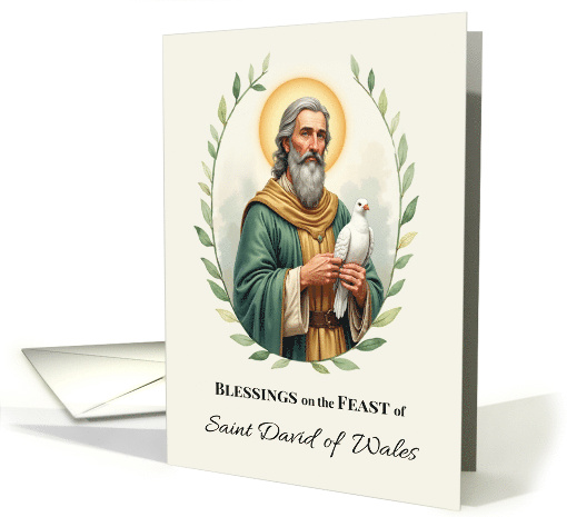 This gentle portrait of Saint David of Wales, shown with a white dove symbolizing peace and the Holy Spirit, honors his Feast Day on March 1. Surrounded by soft watercolor leaves, the image evokes his quiet wisdom and monastic life. A beautiful choice for sending blessings and encouragement rooted in faith and Celtic Christian tradition.