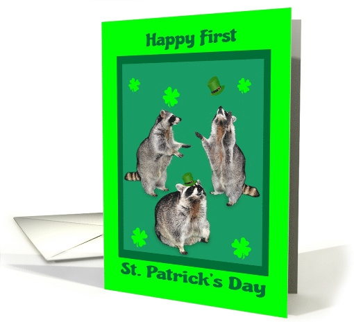 Wish a special baby a Happy First St. Patrick's Day with three adorable raccoons, Bullwinkle, Rocky and Sugar Bear with shamrocks and leprechaun hats in a dark green frame with a light green border. Inside like all Greeting Card Universe cards can be personalized by you if you wish.