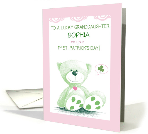 Make your granddaughter’s first St. Patrick’s Day extra special with this personalized keepsake card. A soft green teddy bear sits sweetly alongside a cheerful green shamrock, all framed in a delicate pink border. The front can be customized with her name, creating a heartfelt and unique touch. Inside, a warm and cuddly message shares love and blessings for this memorable milestone. This charming card is the perfect way for grandparents to celebrate their little granddaughter’s first St. Patrick’s Day in a meaningful and personal way.