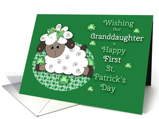 This sweet St. Patrick's Day card for a Granddaughter's first St. Patrick's Day is on a green background featuring a cute fluffy, white sheep wearing a green bow with shamrocks scattered around. Sheep and shamrocks original artwork by Trina Clark at Digital Craft Supplies.