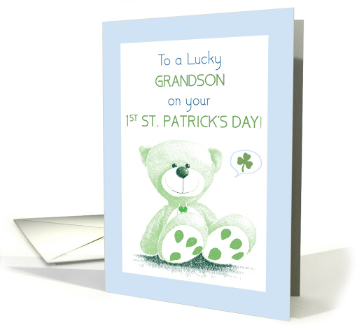 This heartwarming St. Patrick’s Day card for a grandson features a lovable teddy bear in soft green, surrounded by cheerful details. The card's blue border adds a fresh, fun touch, while the bear and green shamrock bring a playful hint of luck. Inside, a cozy, heartfelt message wishes the little one a day filled with warmth, joy, and all the blessings of his first St. Patrick’s Day. This card is a perfect way for grandparents to celebrate this special milestone with their precious grandson.
