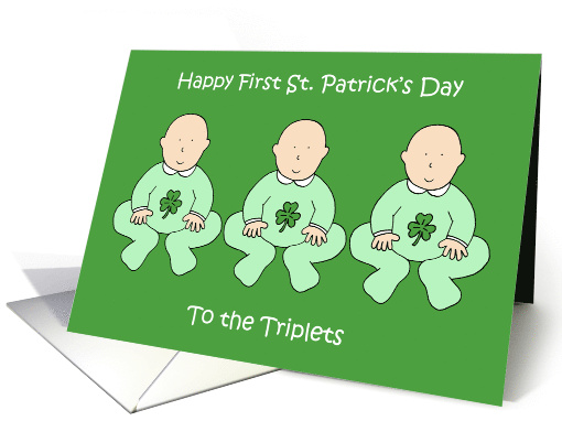 | Artist Notes: | A simple illustration of three cute babies siting in a row wearing pale green outfits with shamrock decorations on them. The words 'Happy First St. Patrick's Day to the Triplets' accompany the image. |
