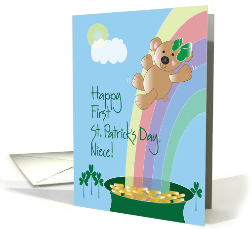 Who is this darling little bear, with the enormous green St. Patrick's bow, who is sliding down the colorful yellow, orange, lavender, blue and green rainbow that arches, through the sky, and into the huge green glistening pot of gold? She's come to help your wish your baby Niece a very Happy First St. Patrick's Day, as she heads for the huge pot filled with gold. She is dropping in to say "Happy First St. Patrick's Day, Niece!" to your darling new little Niece. The message is hand lettered in green to the left of the rainbow, in a whimsical lettering, which adds to the fun of the card.
