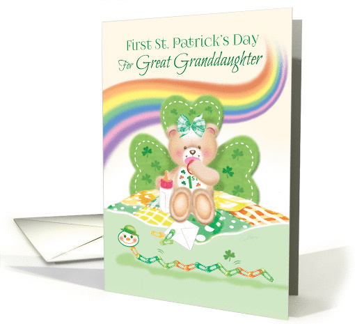 A wiggly toy, a large shamrock, a rainbow and a cute teddy, all make up the sweet illustration on this First St. Patrick's Day for Great Granddaughter.