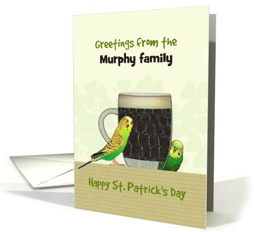 | Artist Notes: | St. Patrick's Day greeting featuring two cute parakeets beside a glass of delicious stout. A bank of shamrock in soft green sits on a soft yellow background. This design is customizable for the sender's family name. |