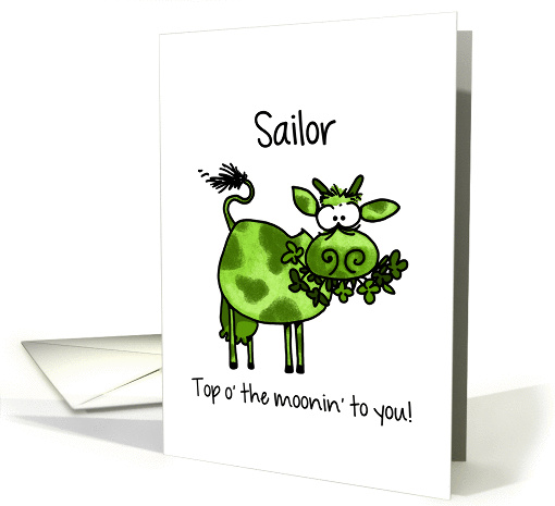 | Artist Notes: | A funny St. Patrick's Day card featuring a bright green Irish cow munching on clover on a white background with the text "Sailor" and "Top o' the moonin' to you!" |