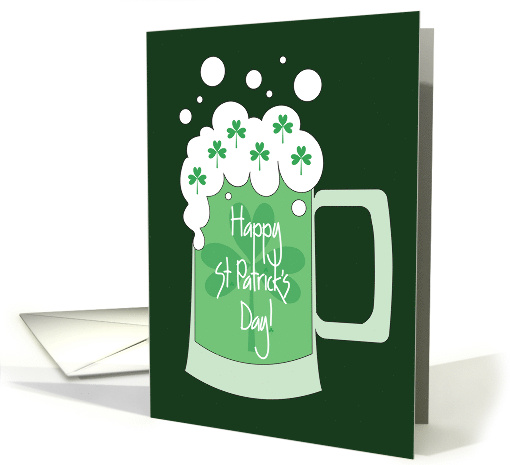 | Artist Notes: | "Happy St. Patrick's Day" is the stacked whimsical white hand lettered wording, written across the front of the light green glass beer mug on this holiday card. The mug is filled with darker green beer that has a large green shamrock inside of it. Mounds of white foam, dotted with tiny green shamrocks crown the beer in the glass. Several round white bubbles rise up above the St. Patrick's beer mug. The inside wording of the card says "Let's raise a mug of beer to celebrate St. Patrick's Day!" |