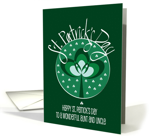 | Artist Notes: | "Happy St. Patrick's Day to a Wonderful Aunt and Uncle" is the wording that rolls across the bottom of this deep emerald green card for this special couple. Above, a canopy of arching white hand lettering has written "St. Patrick's Day", in an elegant semi-circle, at the top of a bright green circle that encloses a modern and stylized shamrock constructed of overlapping ovals. A truly delightful card, the inside wording says "St. Patrick's Day wishes and love for you." |