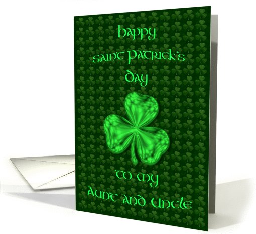 Artist Notes: | A bright green shamrock to send to your your aunt and uncle with a bright green “Happy Saint Patrick’s Day to my Aunt and Uncle” wish - all resting on a darker shamrock background. |