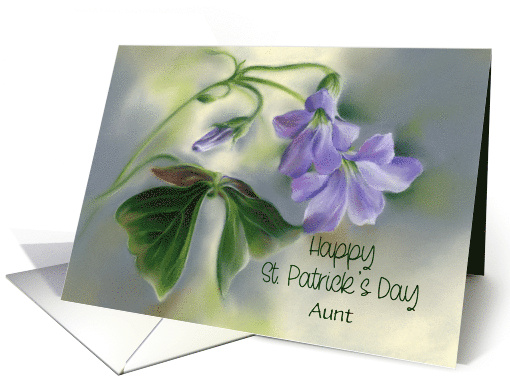 | Artist Notes: | Customize this Saint Patrick’s Day greeting for an aunt or with any name. A stem with purple blossoms and green leaves of the oxalis plant, also called shamrocks, rendered in soft pastel hues with gray and yellow embellish this card. |