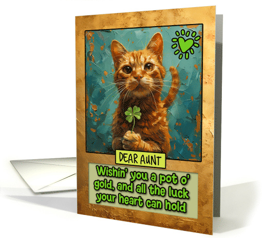 | Artist Notes: | A sweet ginger cat holding a four leaf clover between it's paws on a teal and gold colored background with "dear aunt" in a light green box and the text "Wishin' you a pot o' gold, and all the luck your heart can hold". A great card to send to your wonderful aunt this St. Patrick's Day. |