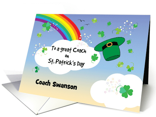 | Artist Notes: | To wish a coach good luck on St. Patrick's Day, give a custom name card. The card depicts a rainbow, clouds, shamrocks, a green hat, and a black headline. A couple of small birds flying in the background. There's room at the bottom of the card for the coach's name. The inside message may be changed, if you wish. ©Gail Pepin |