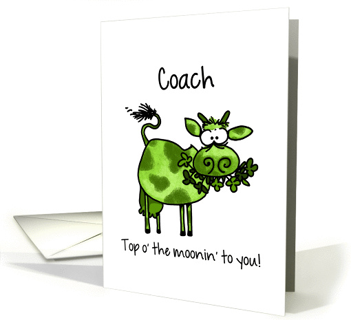 | Artist Notes: | A funny St. Patrick's Day card featuring a bright green Irish cow munching on clover on a white background with the text "Coach" and "Top o' the moonin' to you!" |