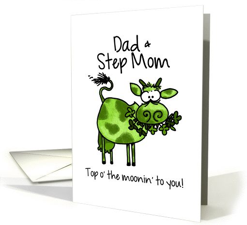 | Artist Notes: | A funny St. Patrick's Day card featuring a bright green Irish cow munching on clover on a white background with the text "Dad & Step Mom" and "Top o' the moonin' to you!" |