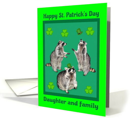 Wish your daughter and family a Happy St. Patrick's Day with a card featuring three adorable raccoons, Sugar Bear, Bullwinkle and Rocky with shamrocks and hats in a dark green frame with a light green border. Fun facts: Shamrocks are the young sprigs of clover or trefoil. The shamrock is a symbol of Ireland. According to a legend, Saint Patrick used it to illustrate the doctrine of the Holy Trinity. The name shamrock is derived from Irish seamróg. This is the diminutive version of the Irish word for clover.