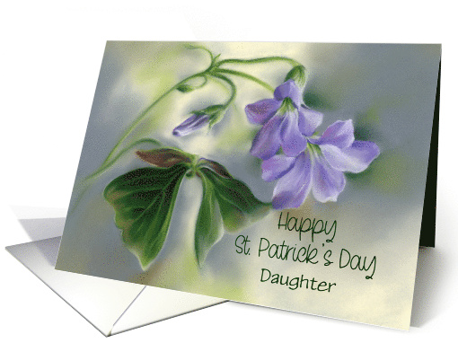 Artist Notes: | Personalized for a daughter or for any recipient, this St. Patrick’s Day card is embellished with botanical art in soft pastel hues depicting a cluster of purple oxalis flowers and the three green leaflets that distinguish this plant as a shamrock. |