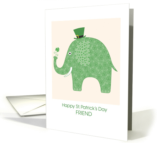 St. Patrick's Day greeting featuring a large green Elephant filled with a shamrock pattern wearing a green top hat and holding a three leaf clover with his trunk.