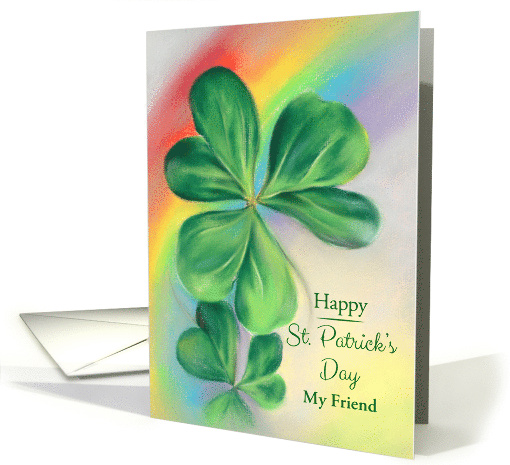 Send a Saint Patrick’s Day blessing to any friend with this easy to personalize card with artwork in vibrant soft pastel colors picturing a couple of green shamrocks set against a multi-colored rainbow.